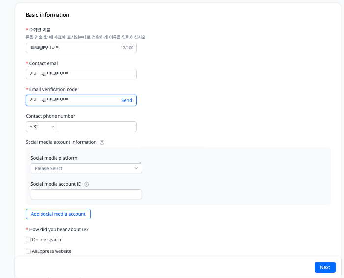 기본적인 인적사항을 적어야 합니다. 메일 인증을 해야하기 때문에 등록한 메일을 확인합니다. 해당 정보를 적어주면 다음으로 넘어갈 수 있습니다. 아래 소셜 미디어는 다음창에서 자세히 적기 때문에 넘어가도 괜찮습니다. 별표 된 부분은 충실히 적어야 합니다.