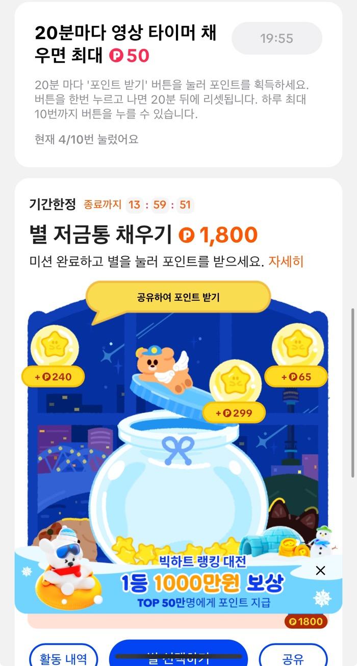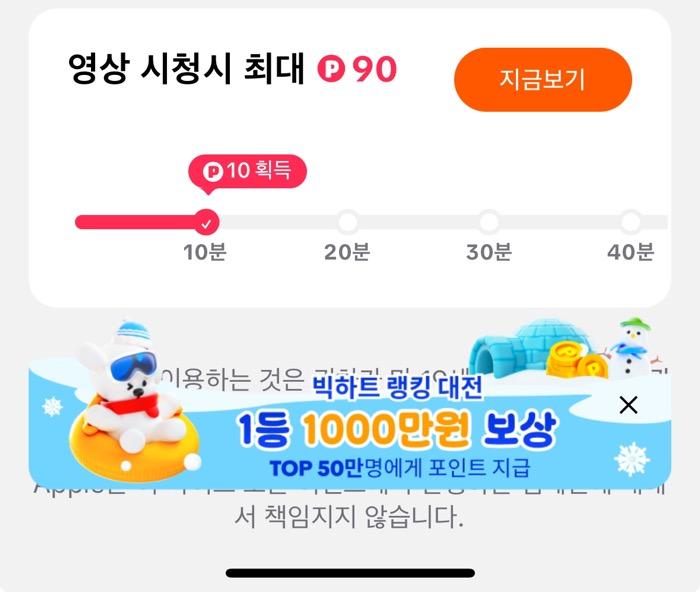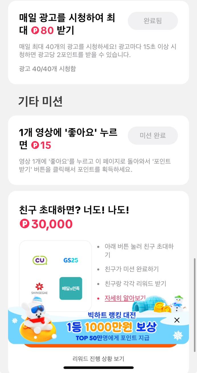 이벤트 후에는 출석 체크와 광고 그리고 영상 시청으로 포인트를 쌓을 수 있습니다.