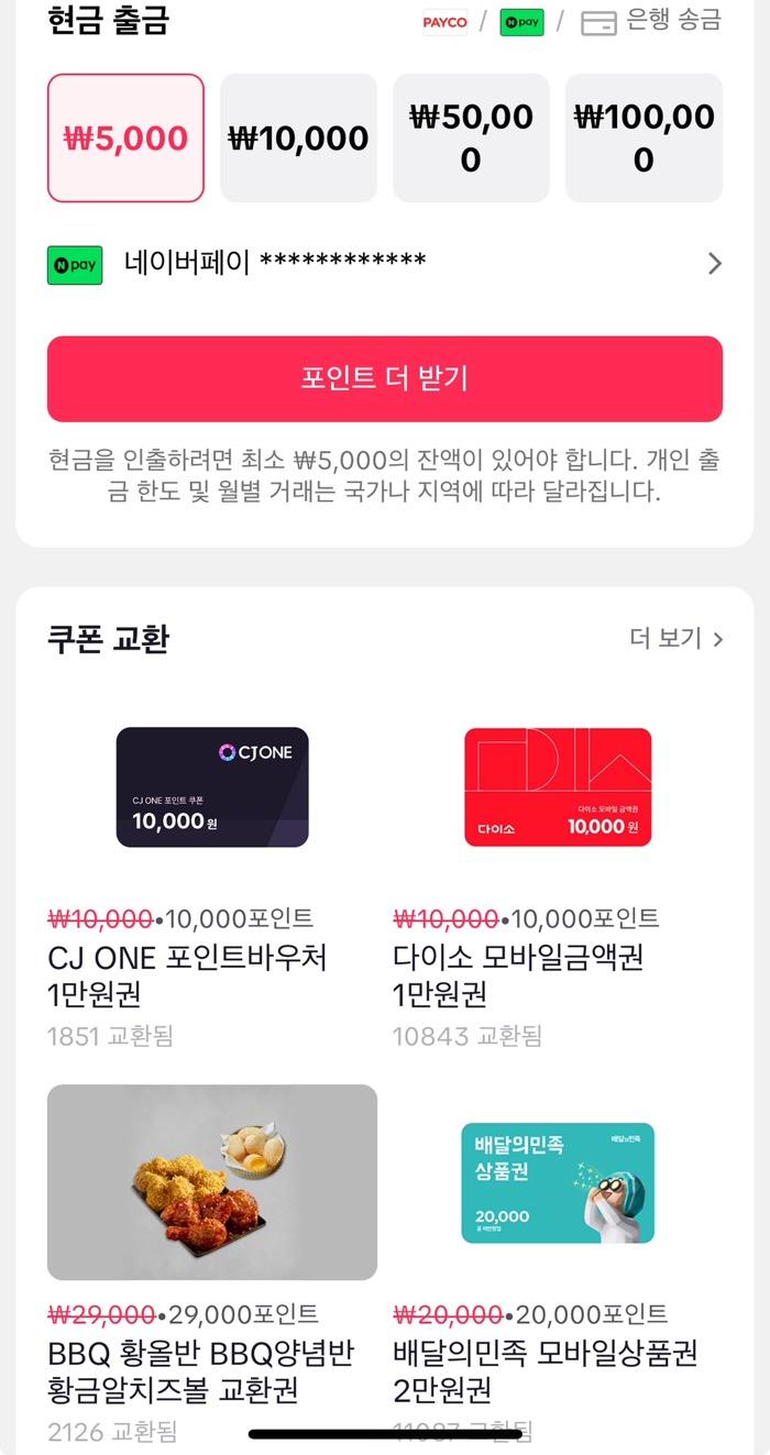 다만 포인트를 받을 수 있는 방법이 많고 꽤 빠르게 채워집니다. 중요한 것은 현금출금과 네이버 포인트로 전환이 가능하단 것이죠.