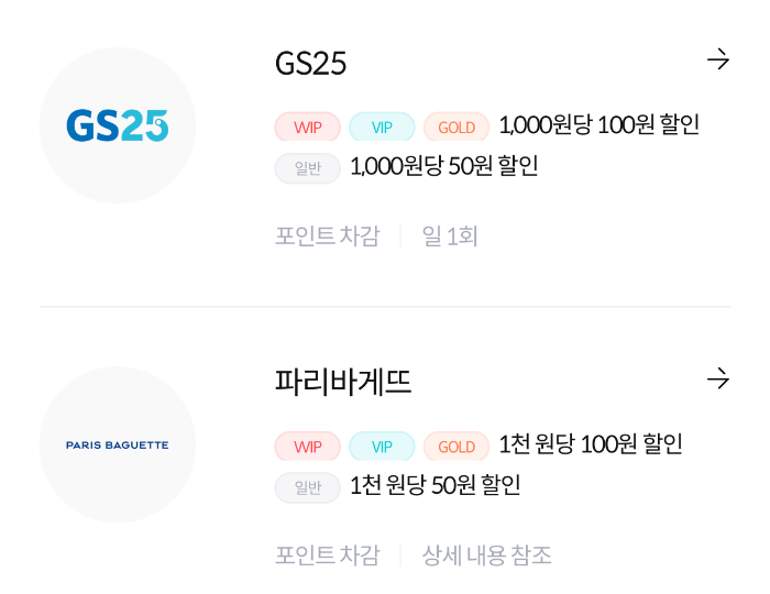 제가 가장 자주 사용하면서도 종종 잊는 혜택. 바로 편의점 할인입니다. gs25, 이마트, cu등에서 할인 적용이 되니 사소한 금액이라도 꼭 할인을 받으세요. 나중에 모아 놓으면 꽤 큰 금액이더라고요. 알뜰살뜰한 소비는 노력이 동반되어야 합니다. 또한 스타벅스 무료 1잔도 놓칠 수 없는 혜택입니다.