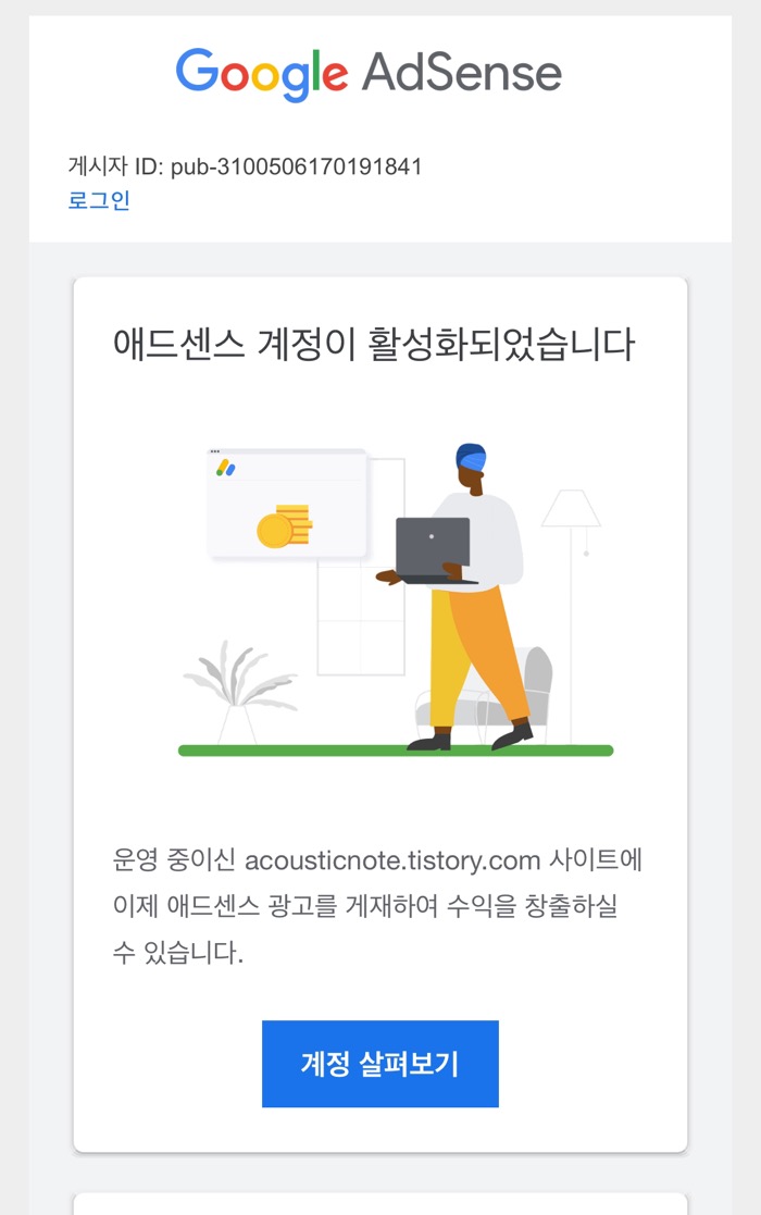 이번달 초부터 티스토리 블로그를 활성화 시켜야 하겠다라고 마음을 먹고 포스팅을 하기 시작했습니다. 그리고 글이 10개를 넘겼을 즈음 애드센스를 신청했습니다. 보통은 20개 정도는 적고 신청하라고들 하시죠? 저는 성격이 좀 급해서인지 20개를 적기 까지 기다리기 힘들어서 일단 경험이나 해보자하고 신청을 했습니다. 금요일에 신청을 하고 주말이 지난 후 월요일에 한통의 메일을 받게 되었습니다.