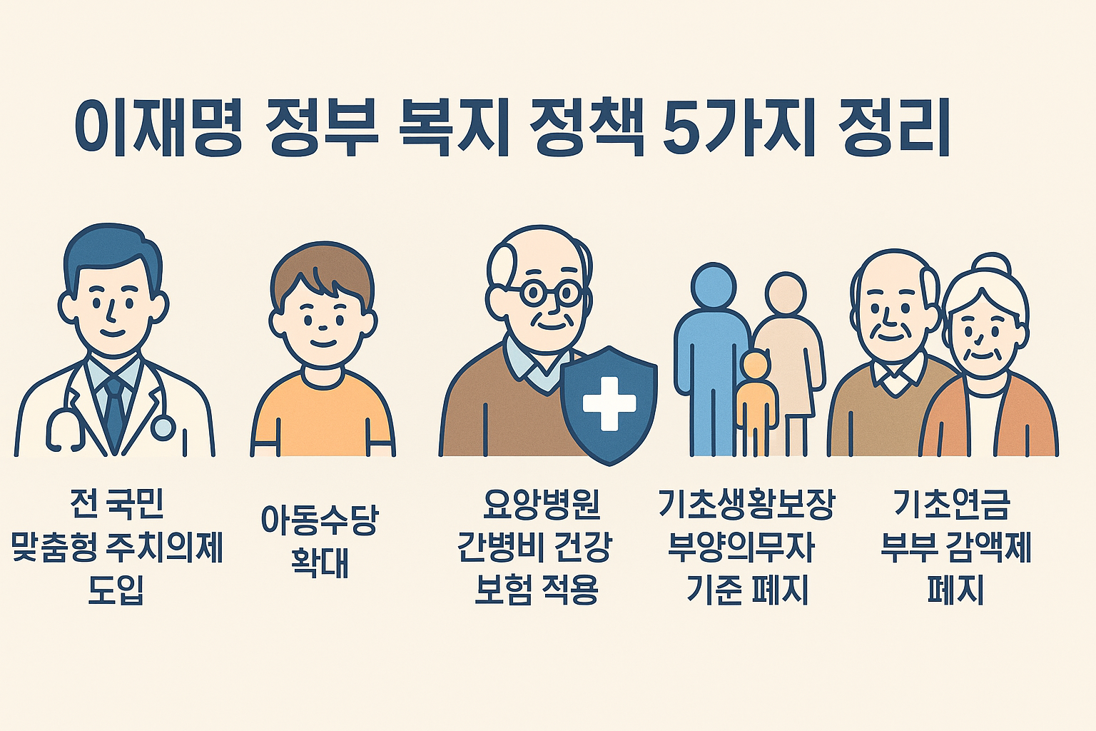 전 국민 맞춤형 주치의제·아동수당 만 18세 확대·요양병원 간병비 건강보험 적용·기초생활보장 부양의무자 기준 폐지·기초연금 부부 감액제 폐지 등 이재명 정부의 핵심 복지 정책 5가지를 정리하고, 각 정책별 신청 방법과 공식 링크를 한 번에 안내합니다.